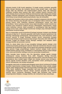 Ditulis oleh para pemikir strategis dengan latar belakang kepemimpinan nasional, buku ini bukan sekadar karya akademik, tetapi sebuah seruan intelektual dan panggilan sejarah. Ia mengajak seluruh anak bangsa untuk berani keluar dari zona nyaman pembangunan incremental menuju transformasi yang berani dan visioner.