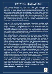 Dalam menangani isu Papua dengan pendekatan kesejahteraan melalui analisis tata kelola pemerintahan yang baik dan berfokus pada empat sektor prioritas Otonomi Khusus di Tanah Papua, yaitu pendidikan, kesehatan, pemberdayaan ekonomi lokal, dan pembangunan infrastruktur fisik serta digital. Buku “Merajut Indonesia dari Tanah Papua: Tata Kelola Pendidikan dan Kesehatan di Papua” ini memberikan rekomendasi untuk Pemerintah Republik Indonesia dengan bersumber pada puluhan focused group discussion (FGD) yang diselenggarakan oleh Kedeputian Pengkajian Strategis Lemhannas. Buku ini berperan untuk menyatukan cara pandang para pemerhati isu Papua untuk secara bersama mencari solusi bagi perdamaian dan pembangunan Tanah Papua yang bersifat permanen agar terwujudnya program pembangunan yang terpadu.