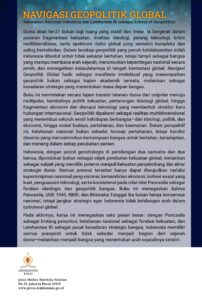 Dunia abad ke-21 bukan lagi ruang yang stabil dan linear. Ia bergerak dalam pusaran fragmentasi kekuatan, rivalitas ideologi, perang teknologi, krisis multilateralisme, serta spektrum risiko global yang semakin kompleks dan saling berkelindan. Dalam lanskap geopolitik yang penuh ketidakpastian inilah Indonesia dituntut untuk tidak sekadar bertahan, tetapi tampil sebagai bangsa yang mampu membaca arah sejarah, merumuskan kepentingan nasional secara jernih, dan meneguhkan kedaulatannya di tengah kontestasi global. Navigasi Geopolitik Global hadir sebagai manifesto intelektual yang menempatkan geopolitik bukan sebagai kajian akademik semata, melainkan sebagai kesadaran strategis yang menentukan masa depan bangsa.